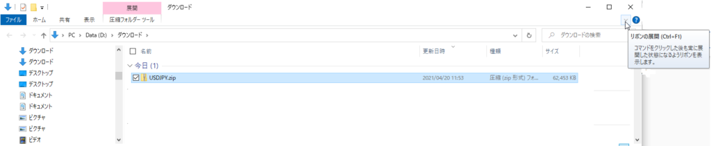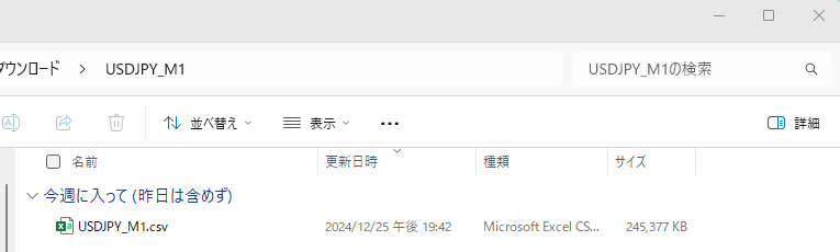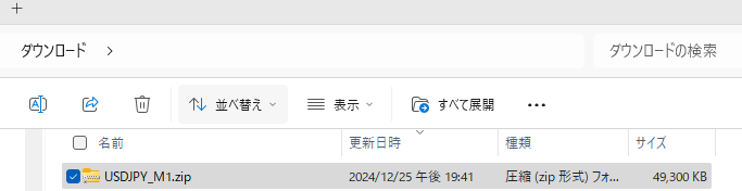 解凍されるとフォルダーの中に「USDJPY(通貨ペア名).csv」というファイルがあります