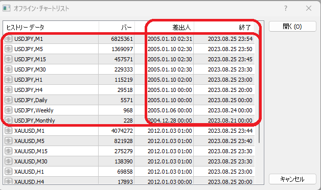 インポートが正しくされたかの確認は「ファイル」→「オフラインチャート」を確認すると見ることができます
