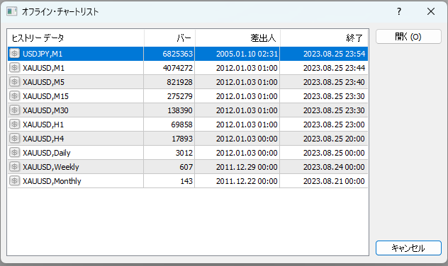 先ほどインポートした通貨ペアの1分足を選択して「開く」をクリックします
