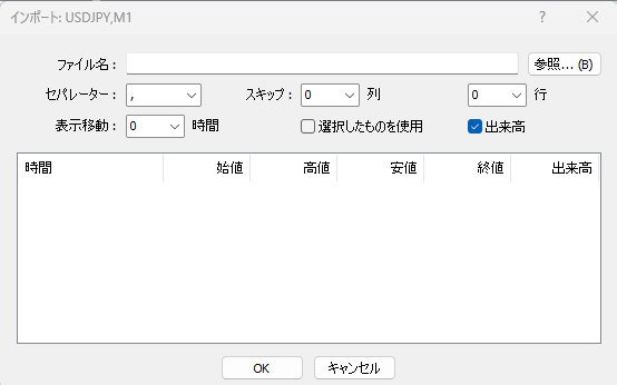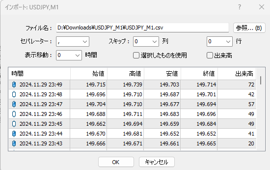 インポートする通貨ペアの1分足を選択して「インポート」をクリックします